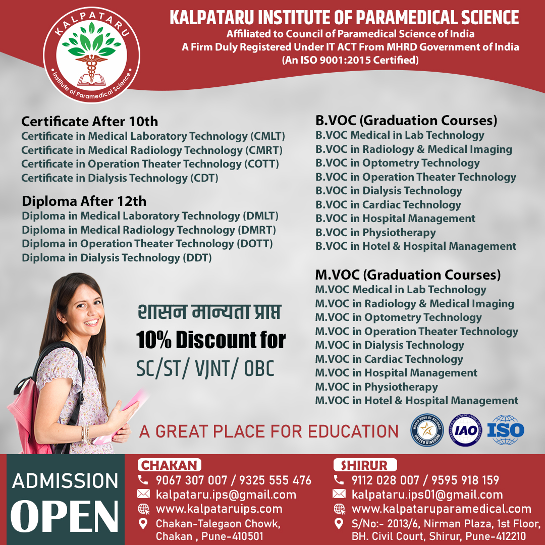 Certificate in Medical Laboratory Technology (CMLT) Certificate in Medical Radiology Technology (CMRT) Certificate in Operation Theater Technology (COTT) Certificate in Dialysis Technology (CDT)